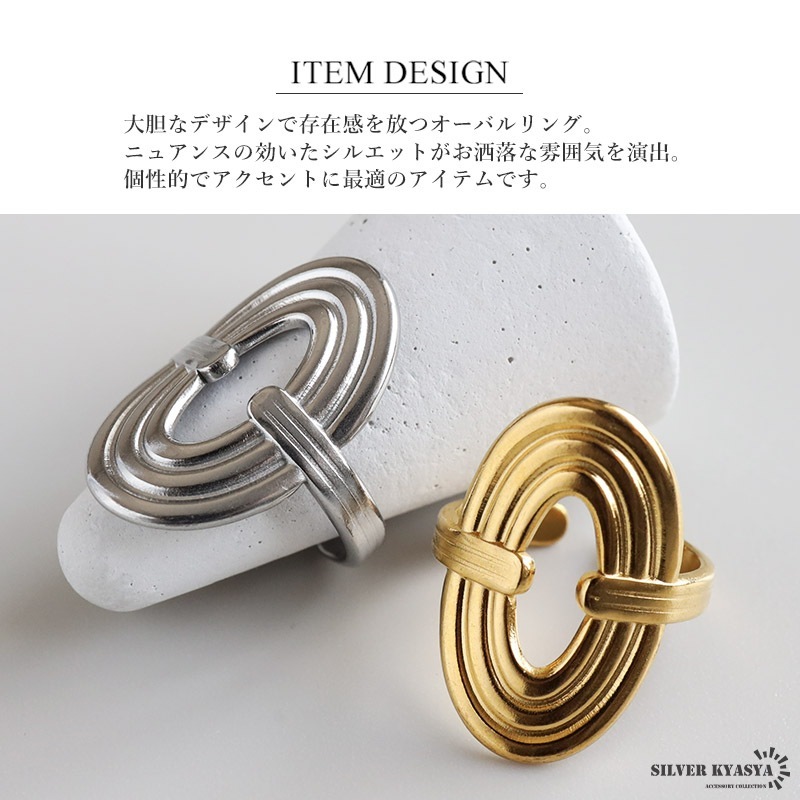 ■ITEM DETAIL 大胆なデザインで存在感を放つオーバルリング。ニュアンスの効いたシルエットがお洒落な雰囲気を演出。個性的でアクセントに最適のアイテムです。 ■ステンレス素材 金属部分は頑丈なことで知られるステンレス素材を採用。耐久性はもちろん耐水性も高く水場での着用も可能。金属アレルギーも出にくいとされている金属です。 | |