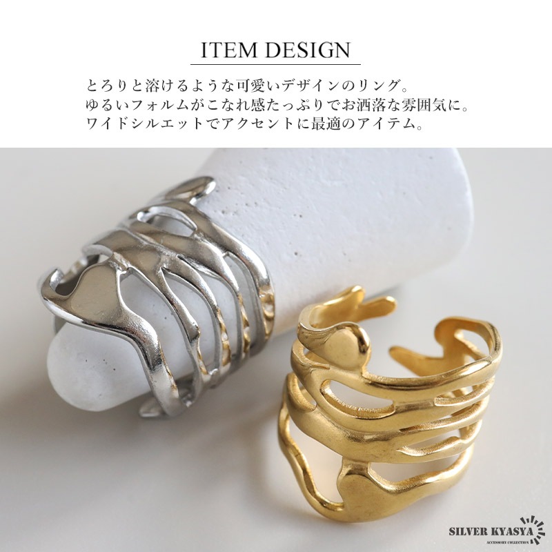■ITEM DETAIL とろりと溶けるような可愛いデザインのリング。ゆるいフォルムがこなれ感たっぷりでお洒落な雰囲気に。ワイドシルエットでアクセントに最適のアイテム。 ■ステンレス素材 金属部分は頑丈なことで知られるステンレス素材を採用。耐久性はもちろん耐水性も高く水場での着用も可能。金属アレルギーも出にくいとされている金属です。 | |