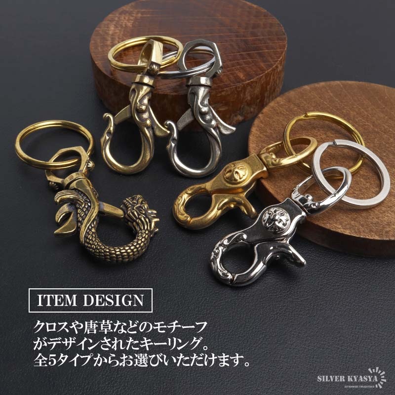 ■ITEM DESIGN クロスや唐草などのモチーフがデザインされたキーリング。全5タイプからお選びいただけます。 | |