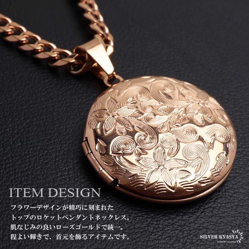 ■ITEM DESIGN フラワーデザインが精巧に刻まれたトップのロケットペンダントネックレス。肌なじみの良いローズゴールドで統一。程よい輝きで、首元を飾るアイテムです。 ■安心のステンレスアイテム 頑丈でお手入れも簡単なステンレス製アクセサリー。錆びることもなくサッと拭くだけメンテもかんたん。金属アレルギーが出にくいのもポイントです。 | |