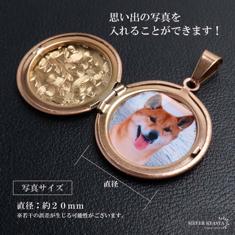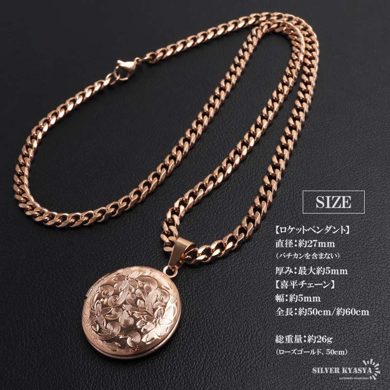 | | ロケットペンダント:直径約27mm(バチカンを含まない)、厚み最大5mm 喜平チェーン:幅約5mm、全長約50cm/約60cm 総重量:約26g(50cm) 中に入る写真のサイズ:直径約20mm(若干の誤差が生じる可能性がございます。) |
