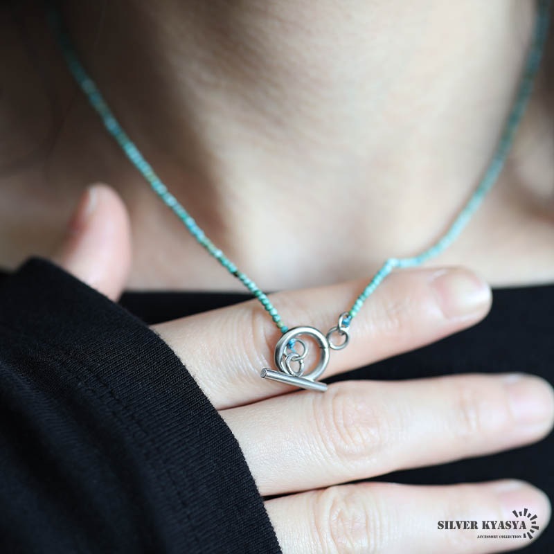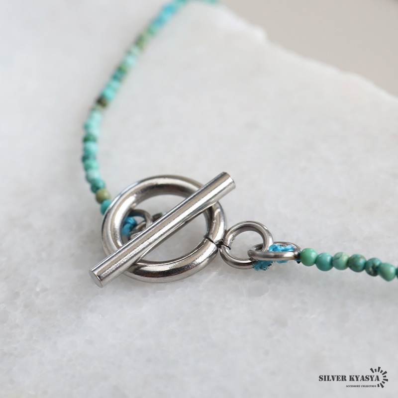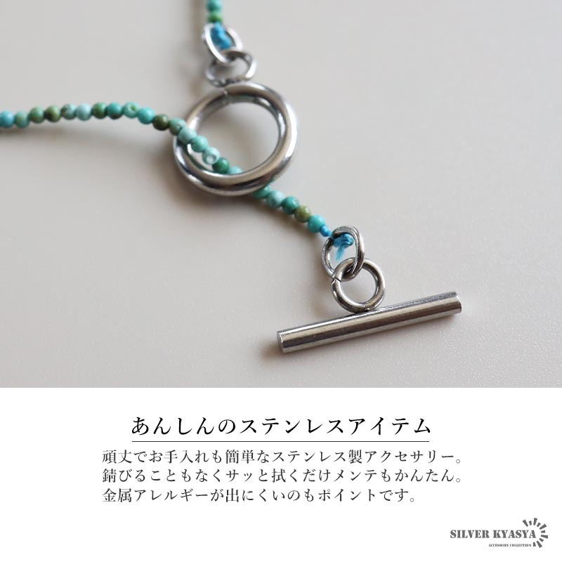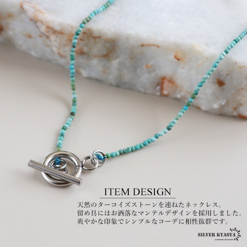 ■ITEM DESIGN 天然のターコイズストーンを連ねたネックレス。留め具にはお洒落なマンテルデザインを採用しました。爽やかな印象でシンプルなコーデに相性抜群です。 ■安心のステンレスアイテム 頑丈でお手入れも簡単なステンレス製アクセサリー。錆びることもなくサッと拭くだけメンテもかんたん。金属アレルギーが出にくいのもポイントです。 ■天然素材 天然物のため模様や形に若干の差があります。一粒一粒の個性として、魅力を楽しめる逸品です。 | |