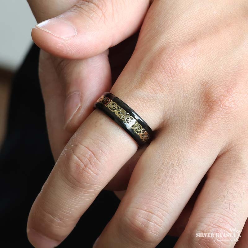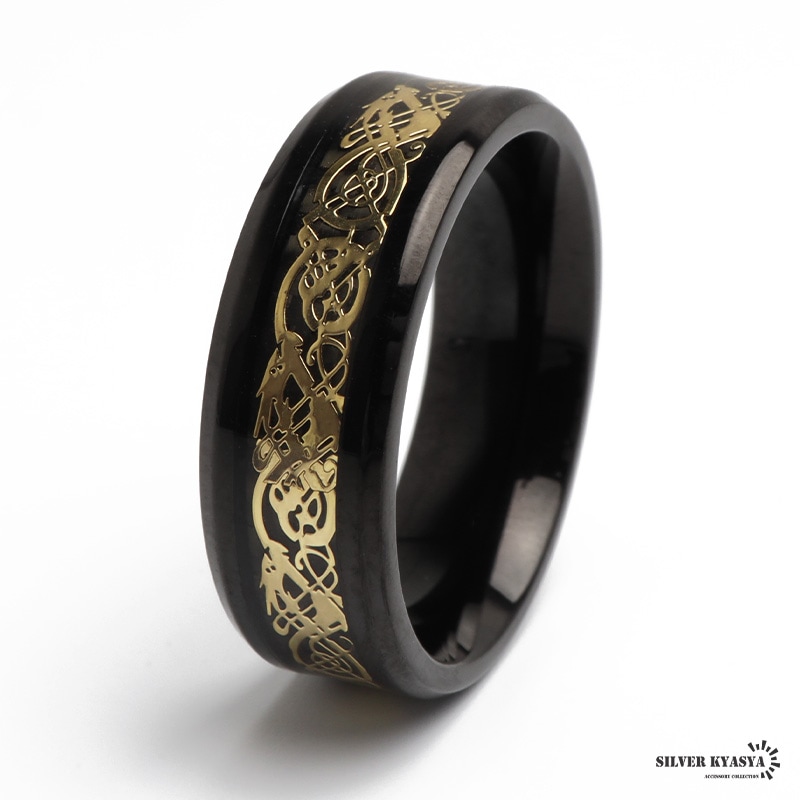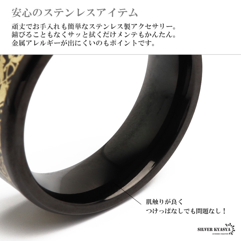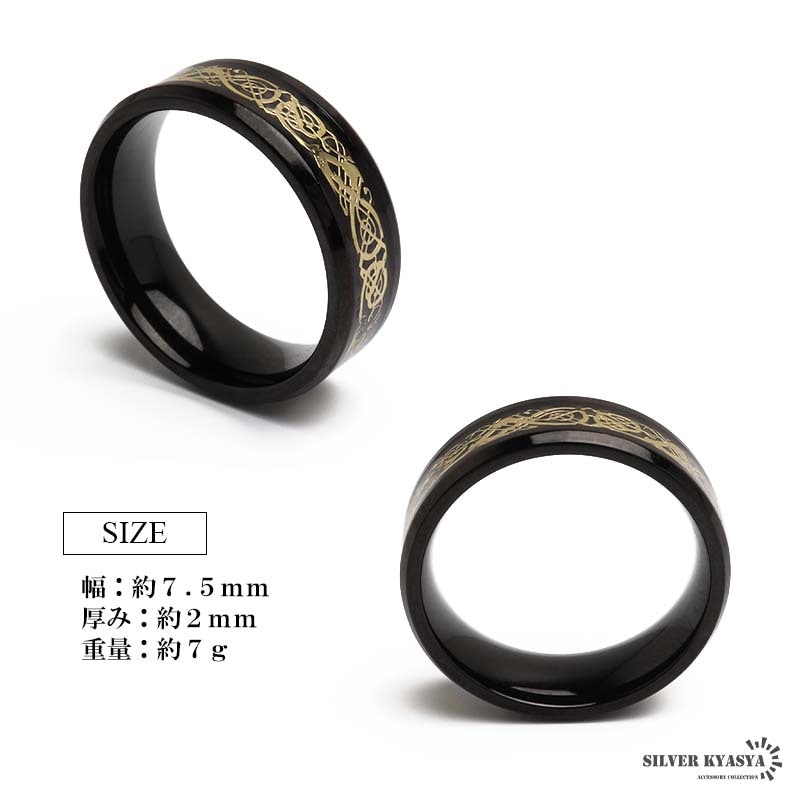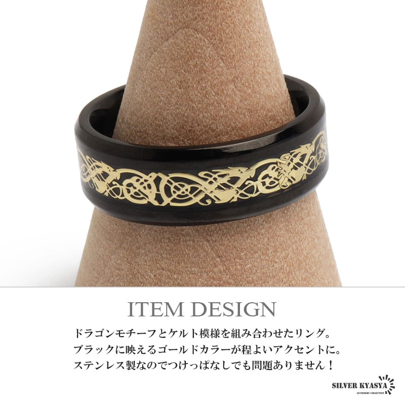 ■ITEM DESIGN ドラゴンモチーフとケルト模様を組み合わせたリング。ブラックに映えるゴールドカラーが程よいアクセントに。ステンレス製なのでつけっぱなしでも問題ありません! ■安心のステンレスアイテム 頑丈でお手入れも簡単なステンレス製アクセサリー。変色、錆びることもなくサッと拭くだけメンテもかんたん。金属アレルギーが出にくいのもポイントです。 | |