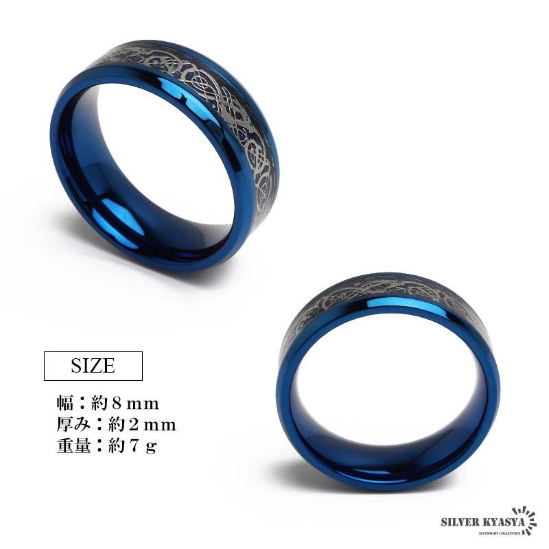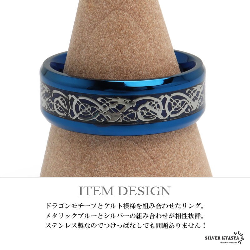 ■ITEM DESIGN ドラゴンモチーフとケルト模様を組み合わせたリング。メタリックブルーとシルバーの組み合わせが相性抜群。ステンレス製なのでつけっぱなしでも問題ありません! ■安心のステンレスアイテム 頑丈でお手入れも簡単なステンレス製アクセサリー。変色、錆びることもなくサッと拭くだけメンテもかんたん。金属アレルギーが出にくいのもポイントです。 | |