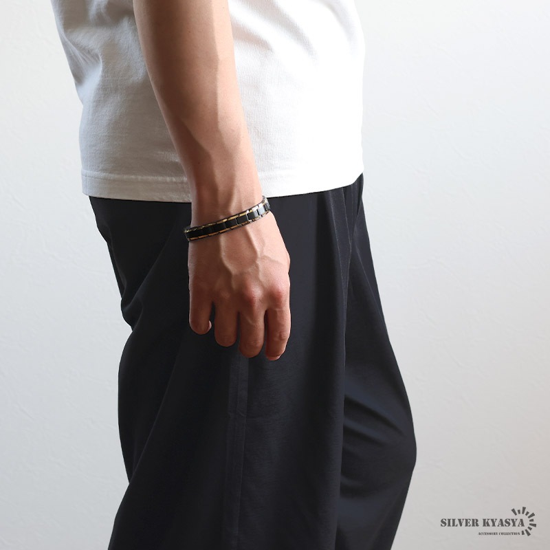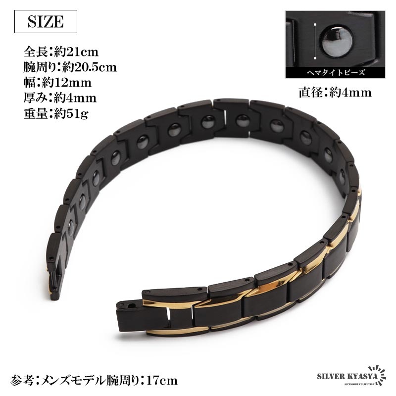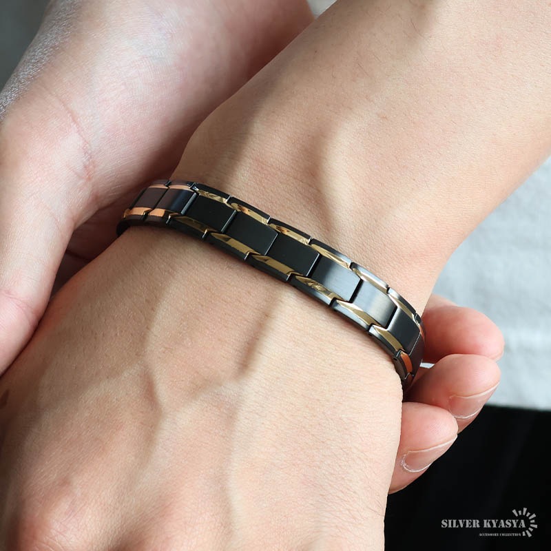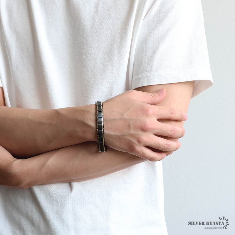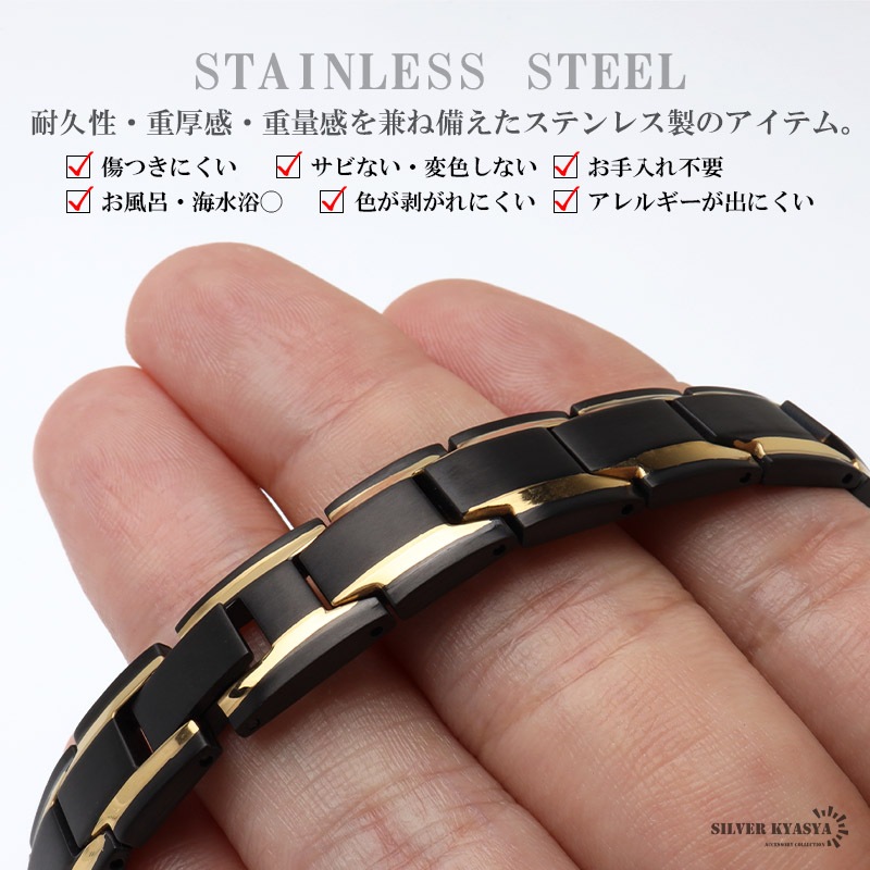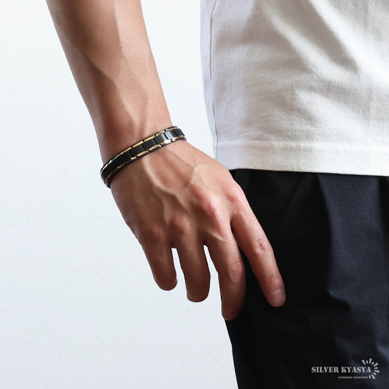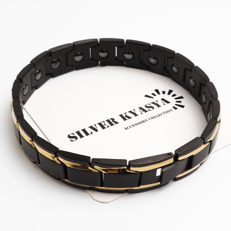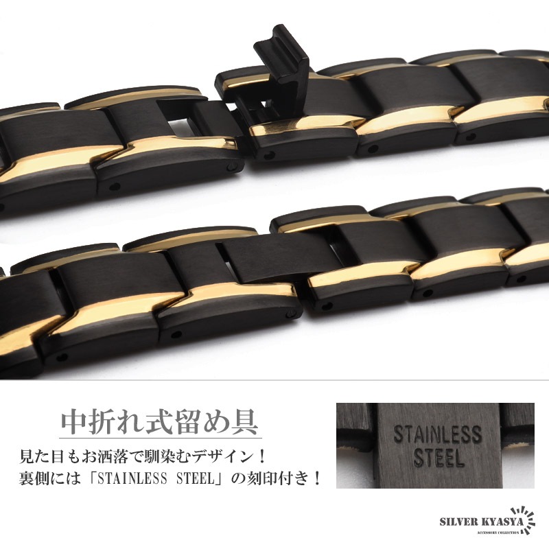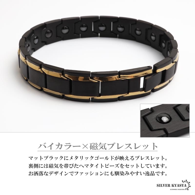 ■バイカラー×磁気ブレスレット マットブラックにメタリックゴールドが映えるブレスレット。裏側には磁気を帯びたヘマタイトビーズをセットしています。お洒落なデザインでファッションにも馴染みやすい逸品です。 ■中折れ式留め具 見た目もお洒落で馴染むデザイン!裏側には「STAINLESS STEEL」の刻印付き! ■安心のステンレスアイテム 頑丈でお手入れも簡単なステンレス製アクセサリー。変色、錆びることもなくサッと拭くだけメンテもかんたん。金属アレルギーが出にくいのもポイントです。 | |