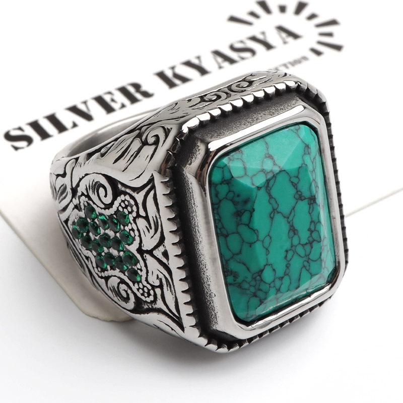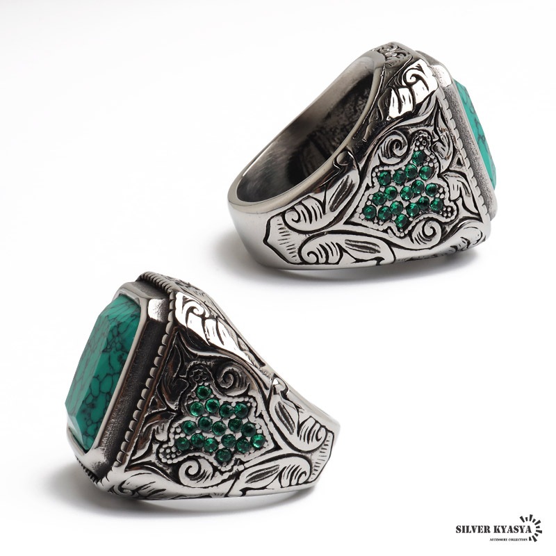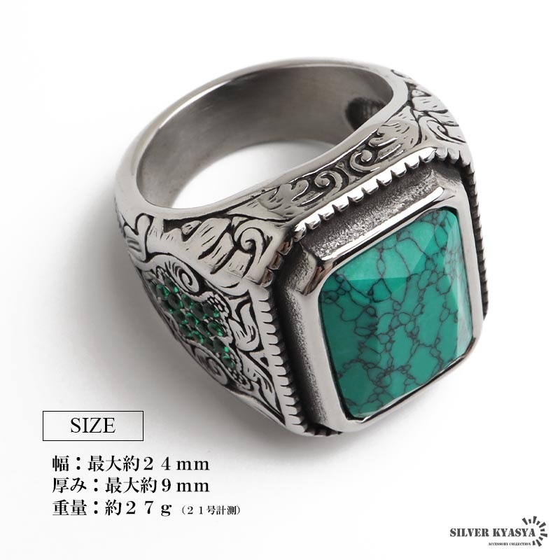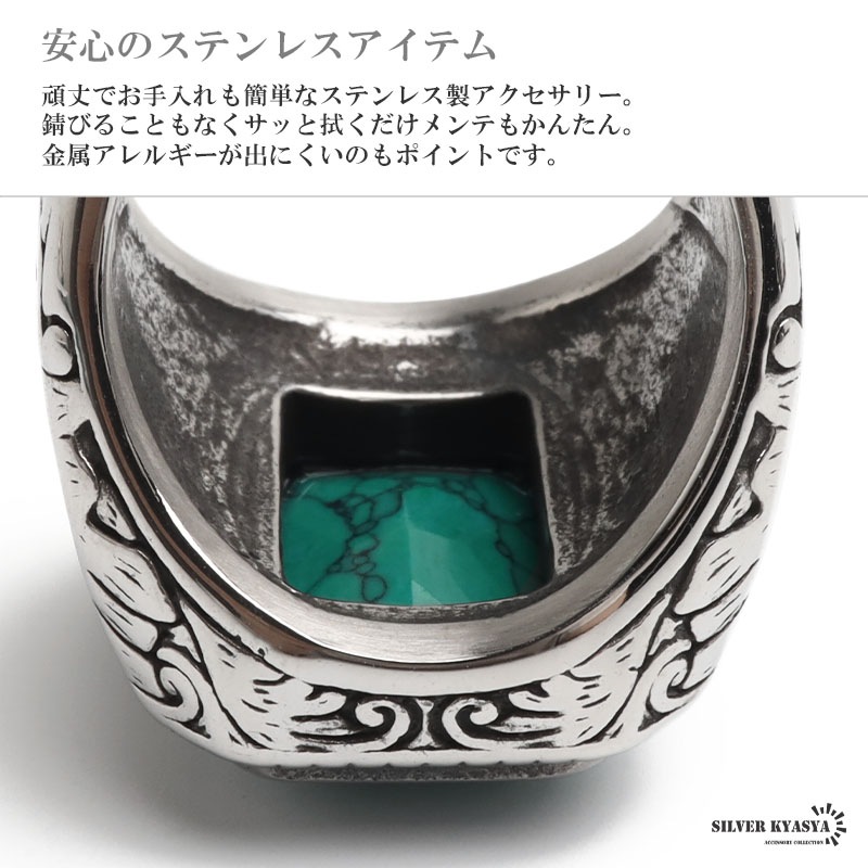 ■ITEM DESIGN 特大のターコイズストーンが圧倒的な存在感のリング。サイドには小粒ストーンと唐草模様がデザインされた逸品。ステンレス製なのでつけっぱなしでも問題ありません! ■安心のステンレスアイテム 頑丈でお手入れも簡単なステンレス製アクセサリー。変色、錆びることもなくサッと拭くだけメンテもかんたん。金属アレルギーが出にくいのもポイントです。 | |