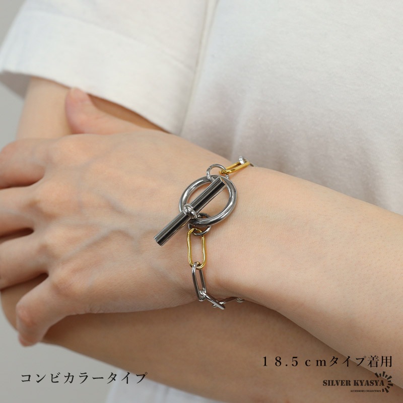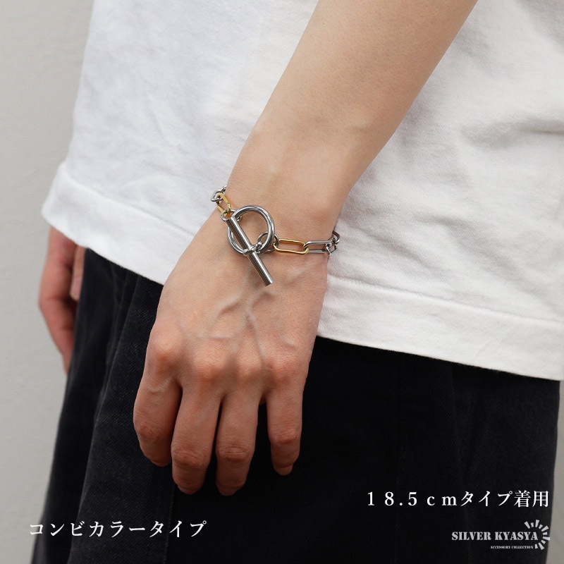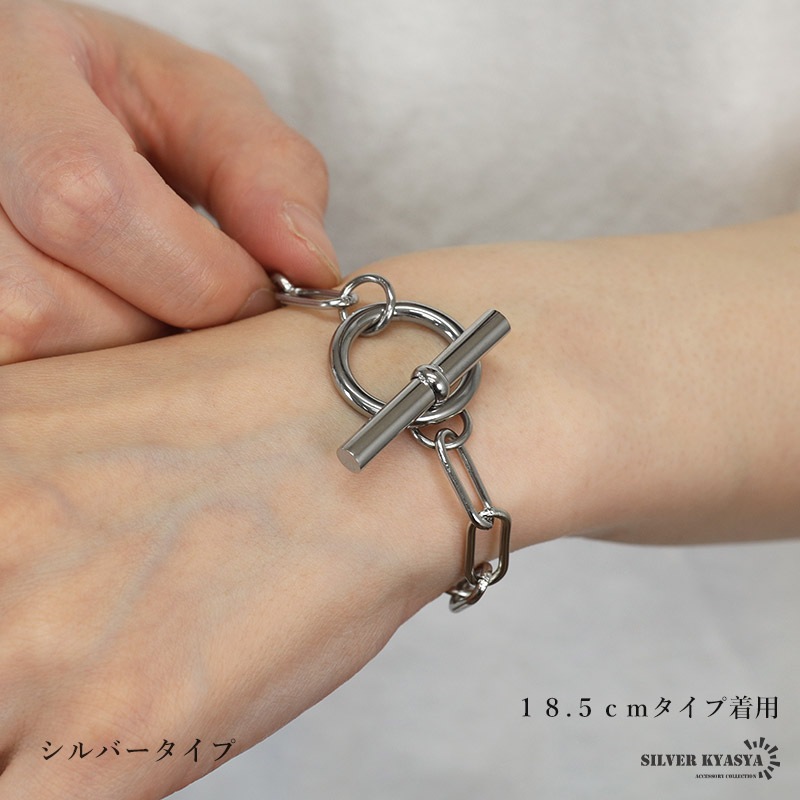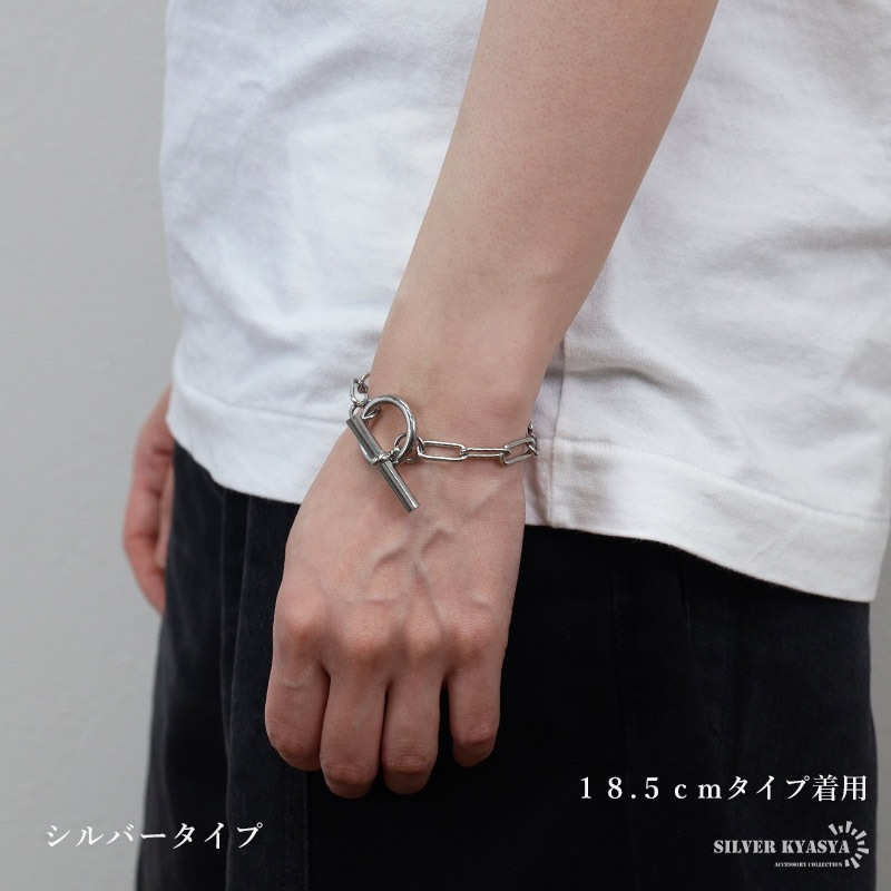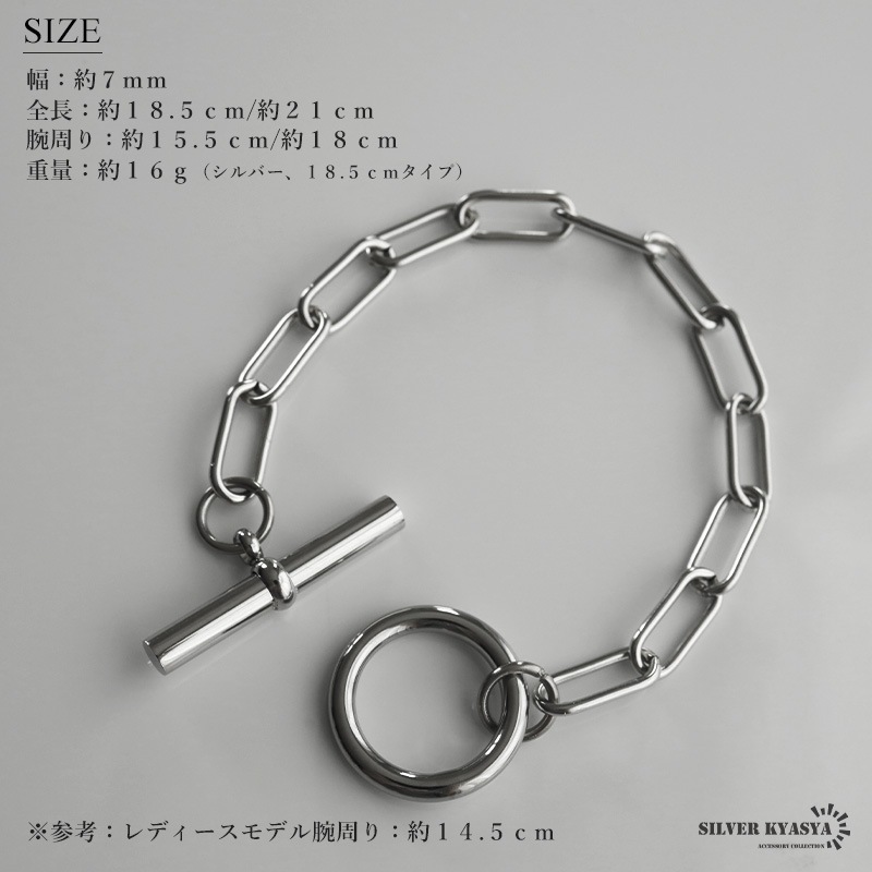 | | 幅:約7mm 全長:約18.5cm/約21cm 腕周り:約15.5cm/約18cm 重量:約16g(シルバー、18.5cmタイプ) ※参考:レディースモデル腕周り:約14.5cm |