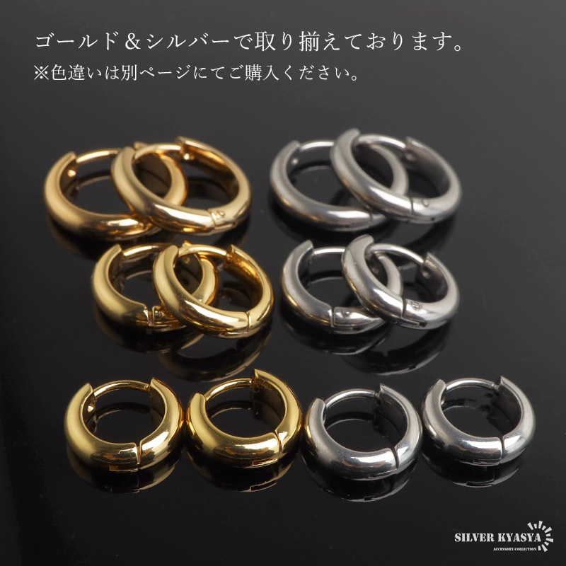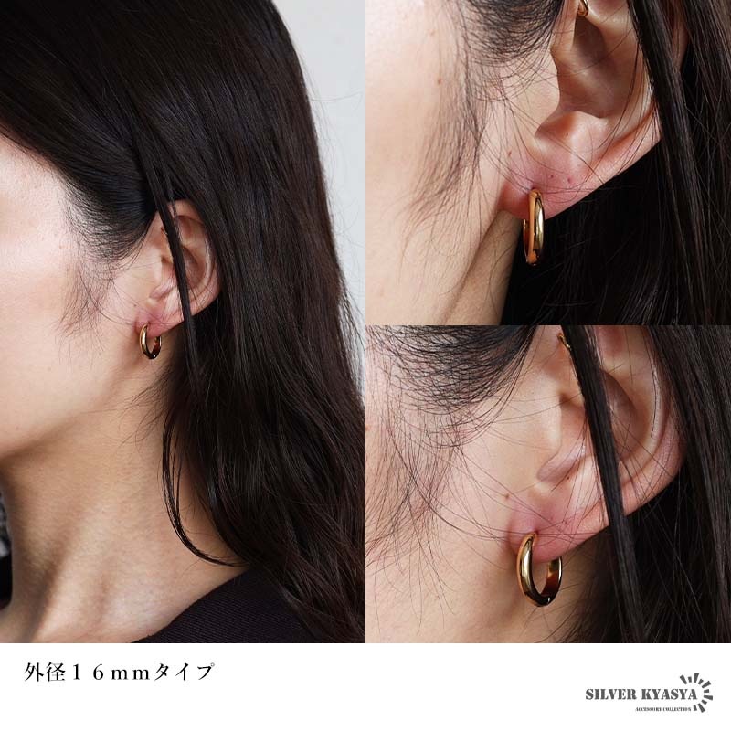 | | 幅:約3mm、厚み:約2mm 外径:約11mm/約13mm/約16mm ピアスポスト:約1mm(18G) ポストの長さ:約5mm/約6mm/約6.5mm 重量:約1g(13mmタイプ、1つ当たり) |