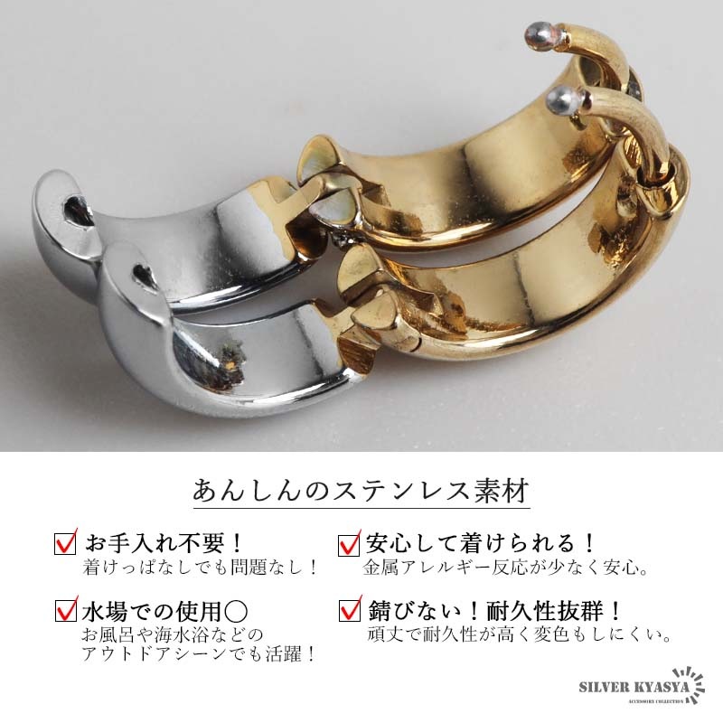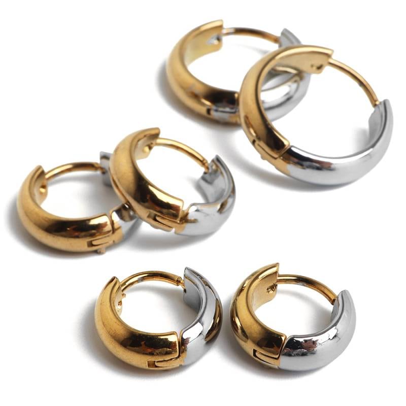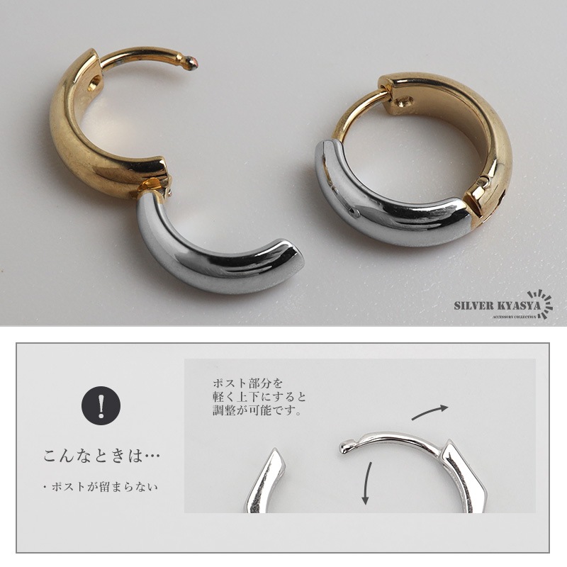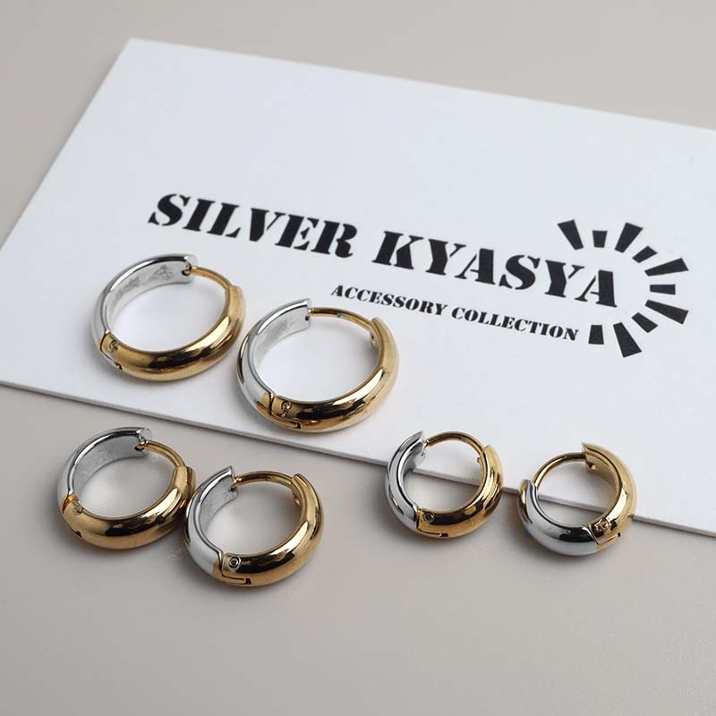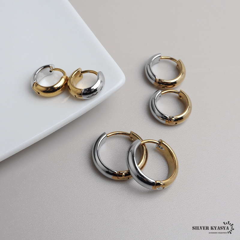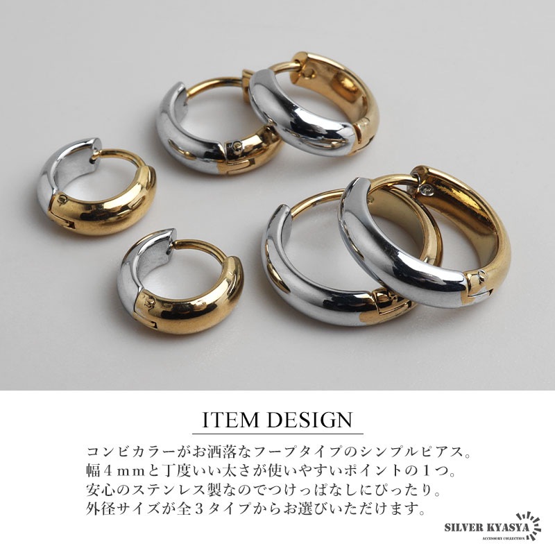 ■ITEM DESIGN コンビカラーがお洒落なフープタイプのシンプルピアス。幅4mmと丁度いい太さが使いやすいポイントの1つ。安心のステンレス製なのでつけっぱなしにぴったり。外径サイズが全3タイプからお選びいただけます。 ■安心のステンレスアイテム 頑丈でお手入れも簡単なステンレス製アクセサリー。変色、錆びることもなくサッと拭くだけメンテもかんたん。金属アレルギーが出にくいのもポイントです。 | |