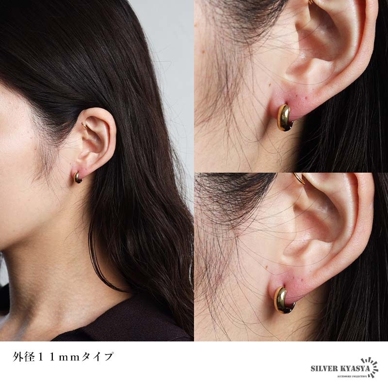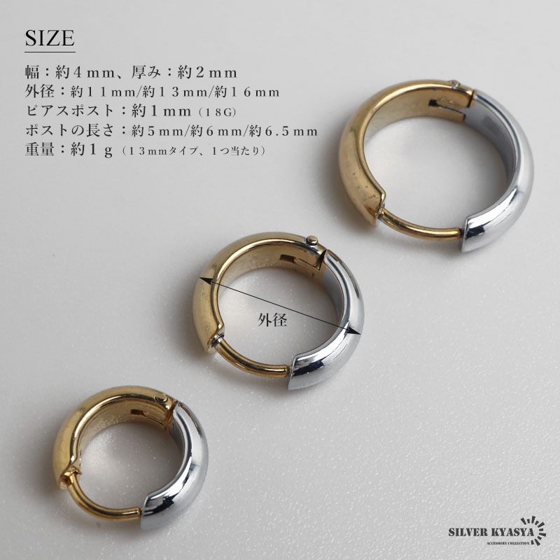 | | 幅:約4mm、厚み:約2mm 外径:約11mm/約13mm/約16mm ピアスポスト:約1mm(18G) ポストの長さ:約5mm/約6mm/約6.5mm 重量:約1g(13mmタイプ、1つ当たり) |