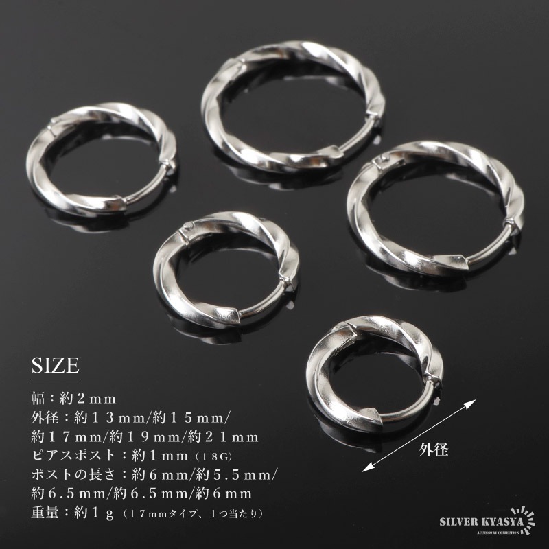 | | 幅:約2mm 外径:約13mm/約15mm/約17mm/約19mm/約21mm ピアスポスト:約1mm(18G) ポストの長さ:約6mm/約5.5mm/約6.5mm/約6.5mm/約6mm 重量:約1g(17mmタイプ、1つ当たり) |