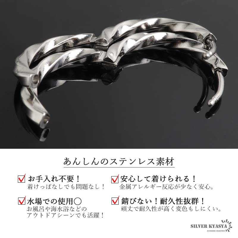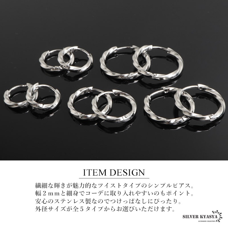 ■ITEM DESIGN 繊細な輝きが魅力的なツイストタイプのシンプルピアス。幅2mmと細身でコーデに取り入れやすいのもポイント。安心のステンレス製なのでつけっぱなしにぴったり。外径サイズが全5タイプからお選びいただけます。 ■安心のステンレスアイテム 頑丈でお手入れも簡単なステンレス製アクセサリー。変色、錆びることもなくサッと拭くだけメンテもかんたん。金属アレルギーが出にくいのもポイントです。 | |