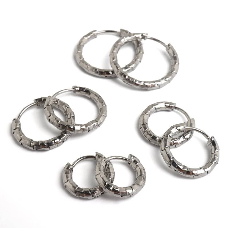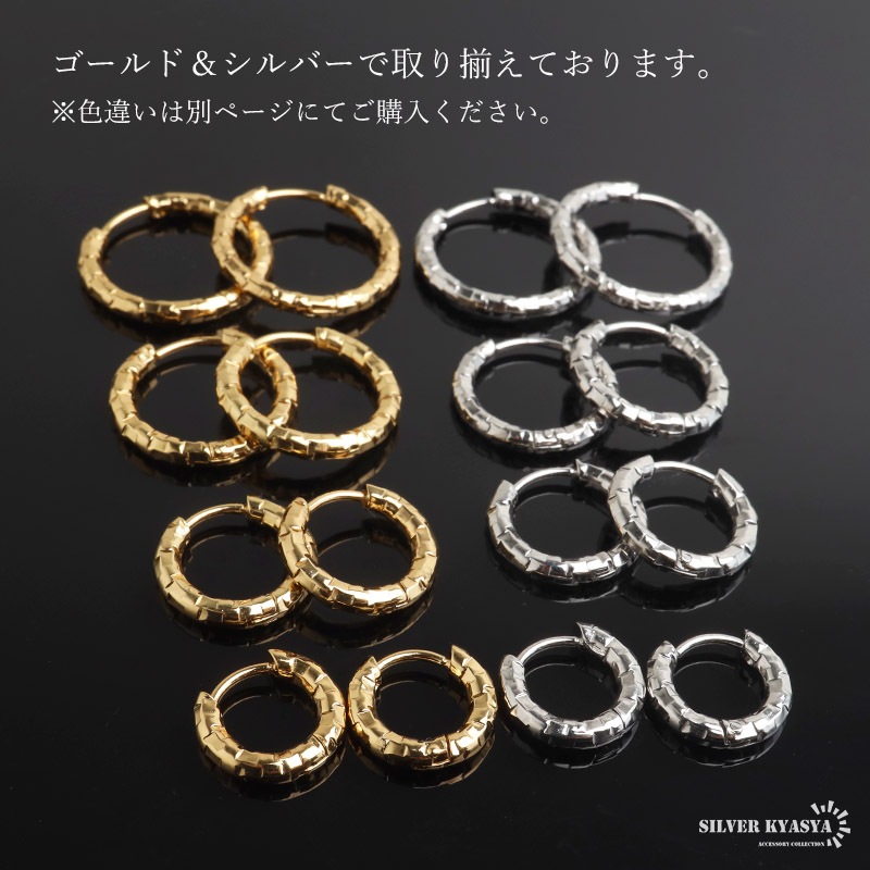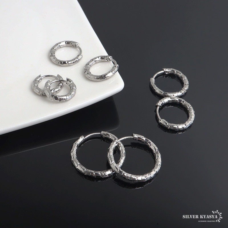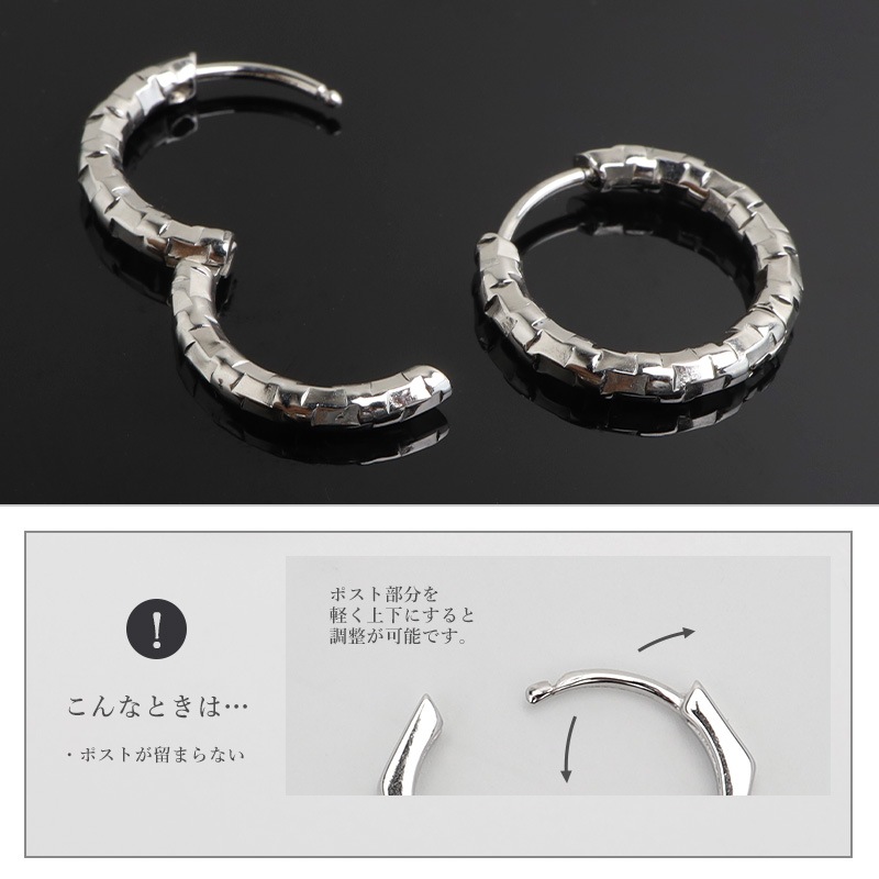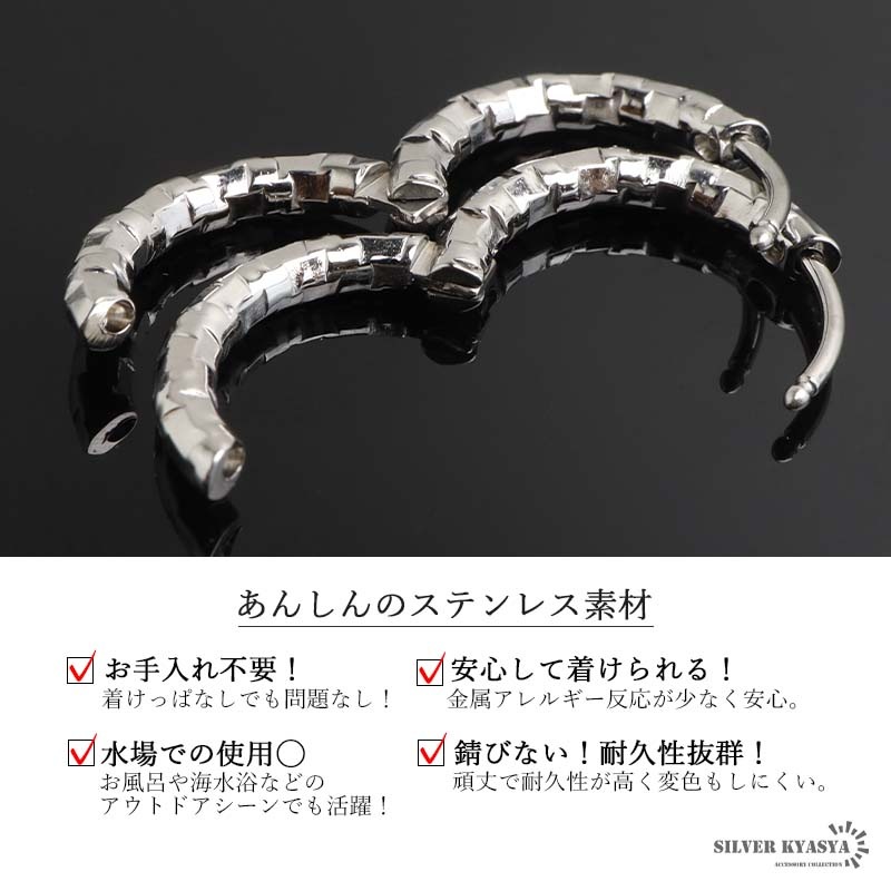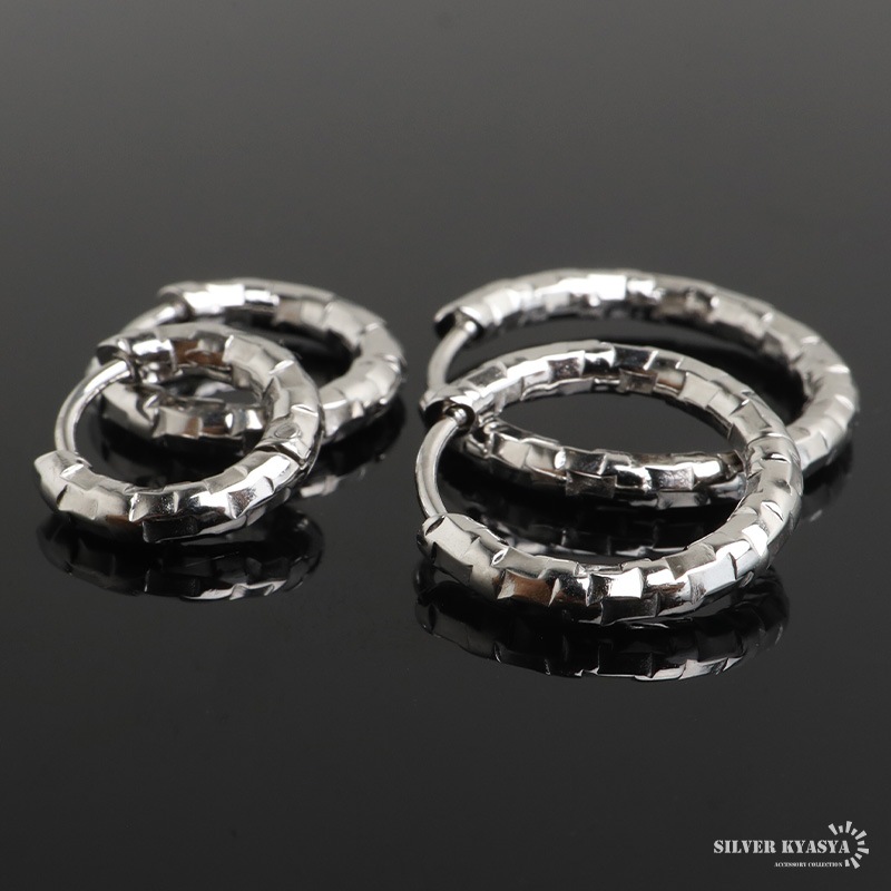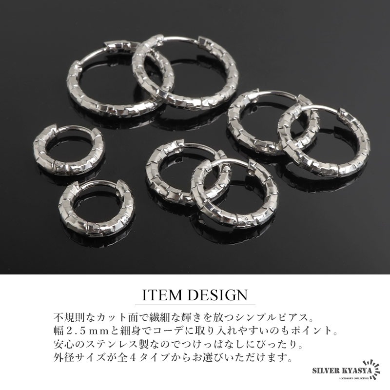 ■ITEM DESIGN 不規則なカット面で繊細な輝きを放つシンプルピアス。幅2.5mmと細身でコーデに取り入れやすいのもポイント。安心のステンレス製なのでつけっぱなしにぴったり。外径サイズが全4タイプからお選びいただけます。 ■安心のステンレスアイテム 頑丈でお手入れも簡単なステンレス製アクセサリー。変色、錆びることもなくサッと拭くだけメンテもかんたん。金属アレルギーが出にくいのもポイントです。 | |