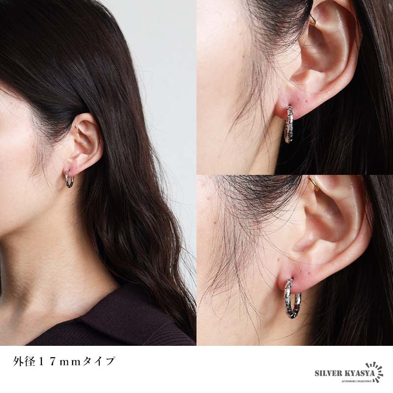 | | 幅:約2.5mm 外径:約13mm/約15mm/約17mm/約21mm ピアスポスト:約1mm(18G) ポストの長さ:約6mm/約6.5mm/約7mm/約6.5mm 重量:約1g(15mmタイプ、1つ当たり) |