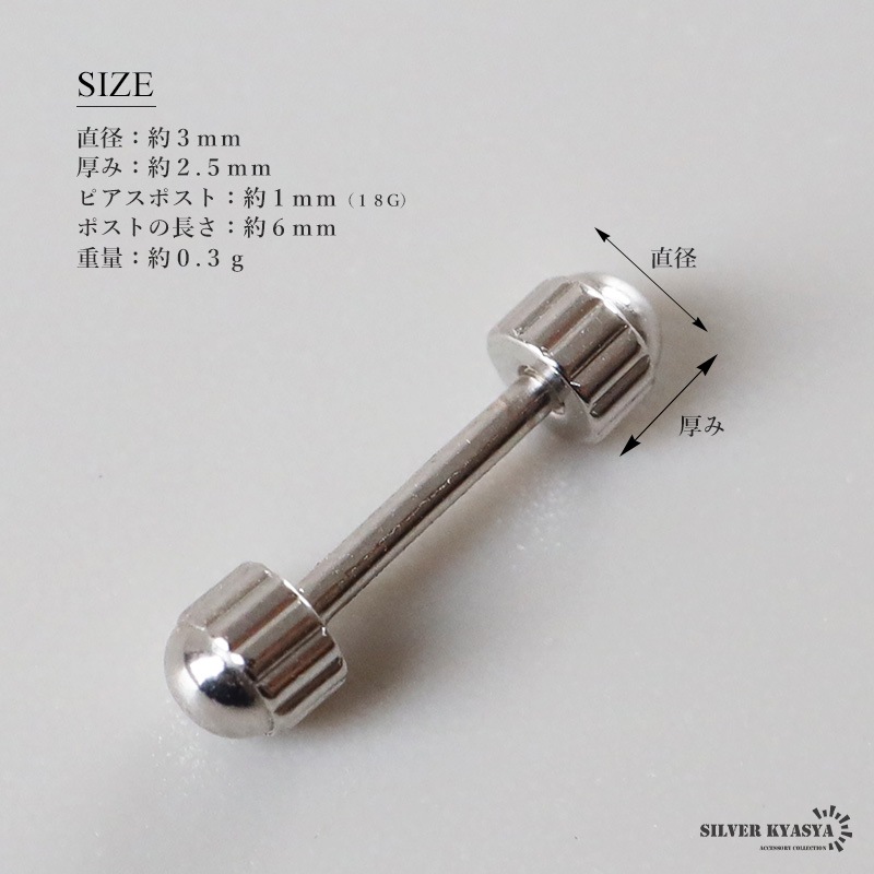 | | 直径:約3mm 厚み:約2.5mm ピアスポスト:約1mm(18G) ポストの長さ:約6mm 重量:約0.3g |