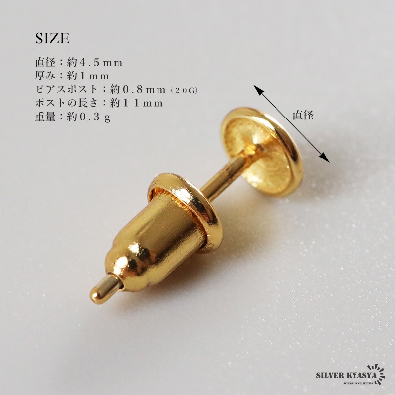 | | 直径:約4.5mm 厚み:約1mm ピアスポスト:約0.8mm(20G) ポストの長さ:約11mm 重量:約0.3g |