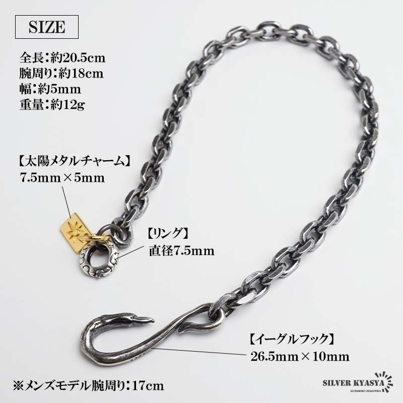| | 全長:約20.5cm 腕周り:約18cm 幅:約5mm 太陽メタルチャーム:7.5mm×5mm、リング:直径7.5mm、イーグルフック:26.5mm×10mm 重量:約12g ※メンズモデル腕周り:17cm |