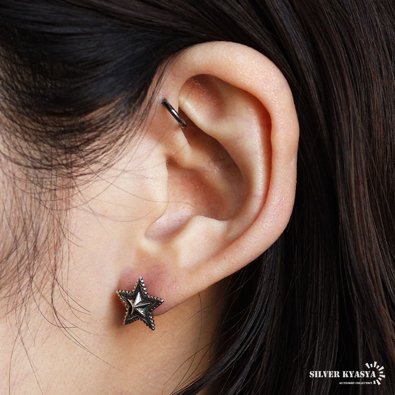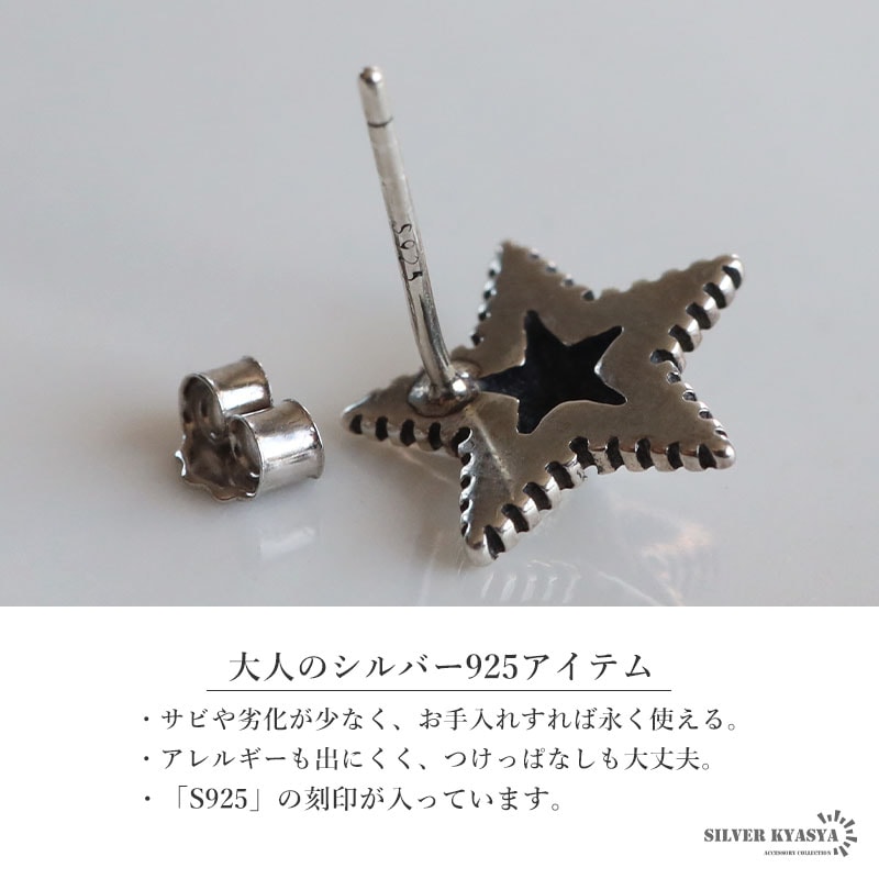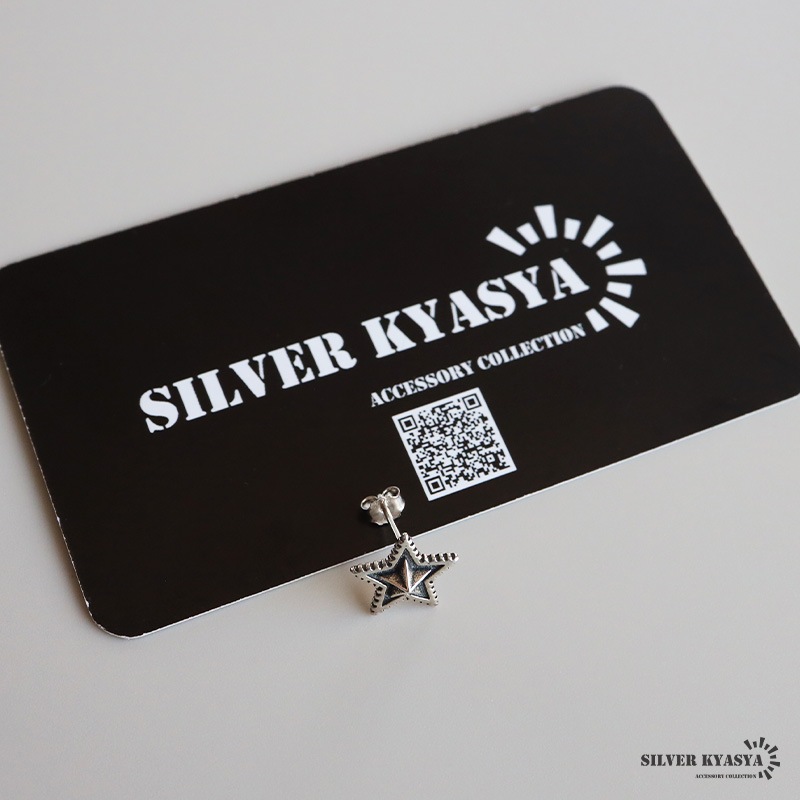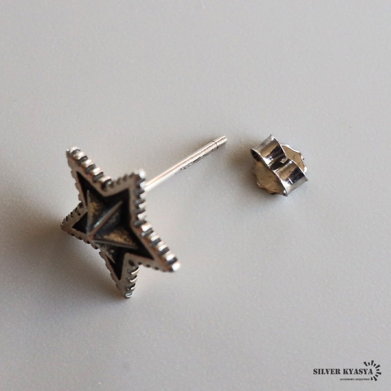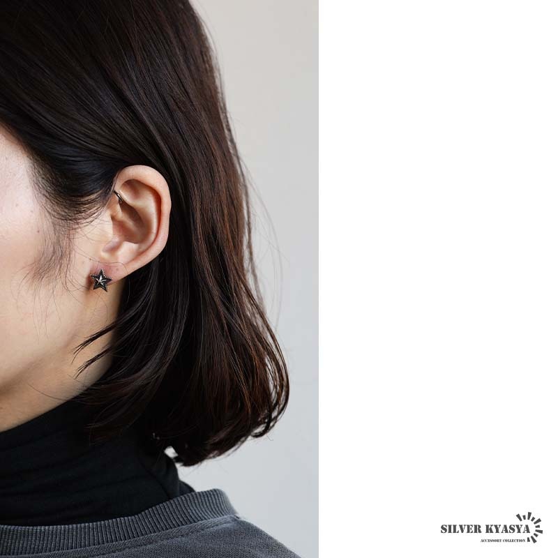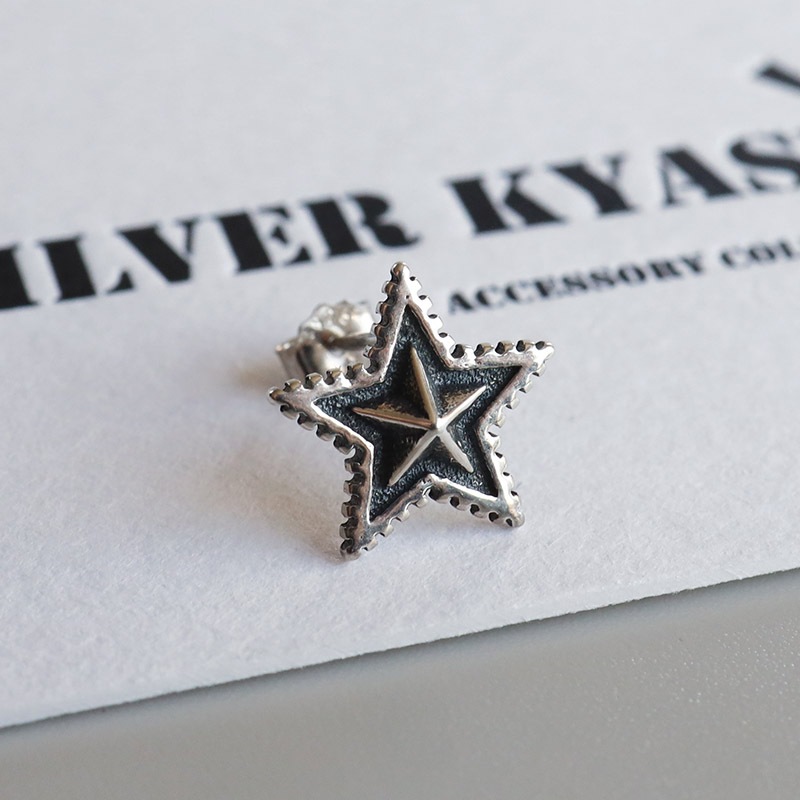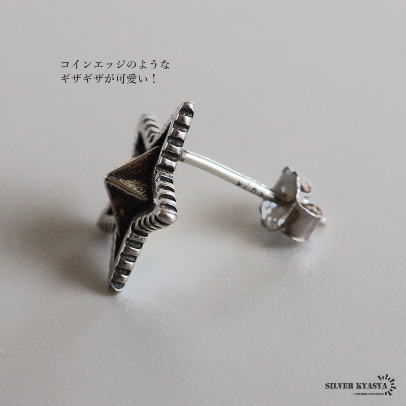 ■ITEM DESIGN ギザギザのフチが特徴的なスターモチーフのピアス。燻しによるアンティーク感と立体的なフォルムがポイント。シルバー925の上品な輝きが魅力的なアイテムです。単品使いでもさり気ない存在感を演出してくれます。 ■大人のシルバー925 大人の魅力あふれるシルバー925素材を採用。「925」とは銀の含有率(純度)92.5%を示し、一般的に純銀として扱われます。サビや劣化等がほとんどなく金属アレルギーも出にくいとされており、アクセサリーとしての実用性もある金属です。 | |