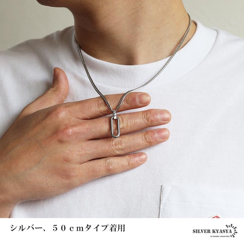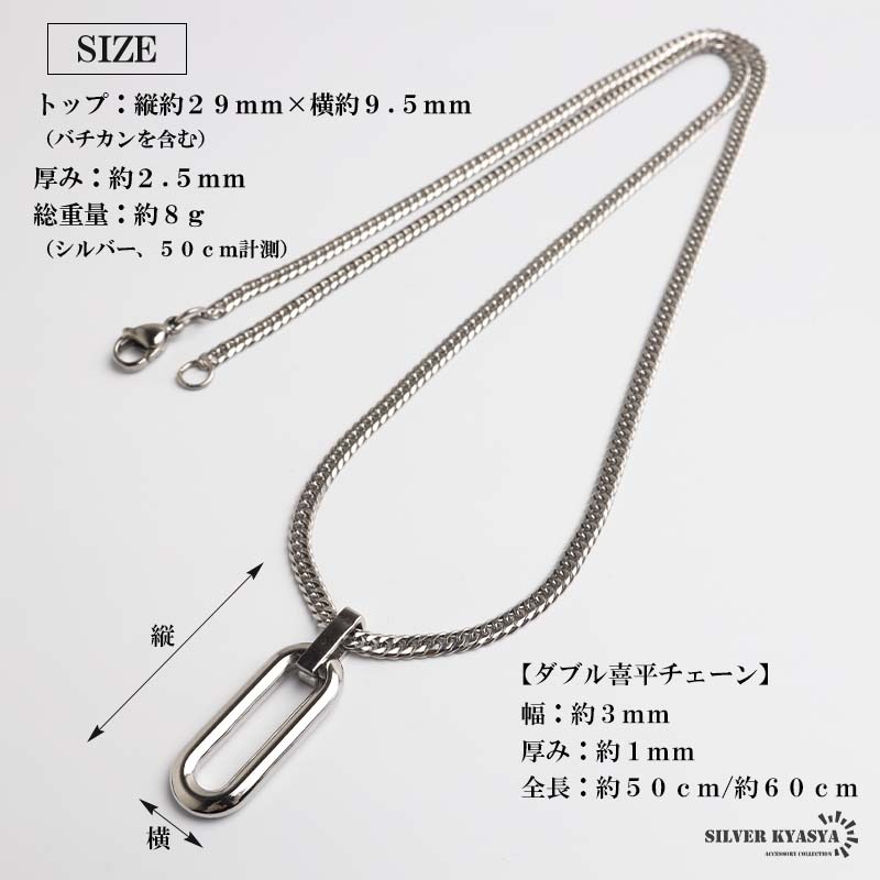 | | トップ:縦約29mm×横約9.5mm(バチカンを含む) 厚み:約2.5mm ダブル喜平チェーン:幅約3mm、厚み約1mm、全長約50cm/60cm 総重量:約8g(シルバー、50cm計測) |
