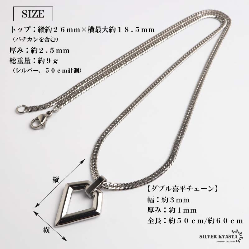 | | トップ:縦約26mm×横最大約18.5mm(バチカンを含む) 厚み:約2.5mm ダブル喜平チェーン:幅約3mm、厚み約1mm、全長約50cm/60cm 総重量:約9g(シルバー、50cm計測) |