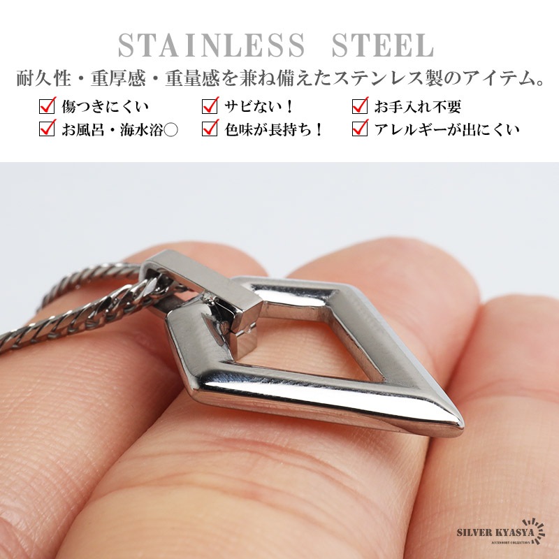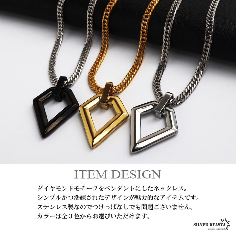 ■ITEM DESIGN ダイヤモンドモチーフをペンダントにしたネックレス。シンプルかつ洗練されたデザインが魅力的なアイテムです。ステンレス製なのでつけっぱなしでも問題ございません。カラーは全3色からお選びいただけます。 ■安心のステンレスアイテム 頑丈でお手入れも簡単なステンレス製アクセサリー。錆びることもなくサッと拭くだけメンテもかんたん。金属アレルギーが出にくいのもポイントです。 | |