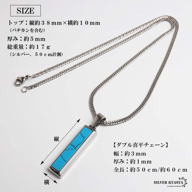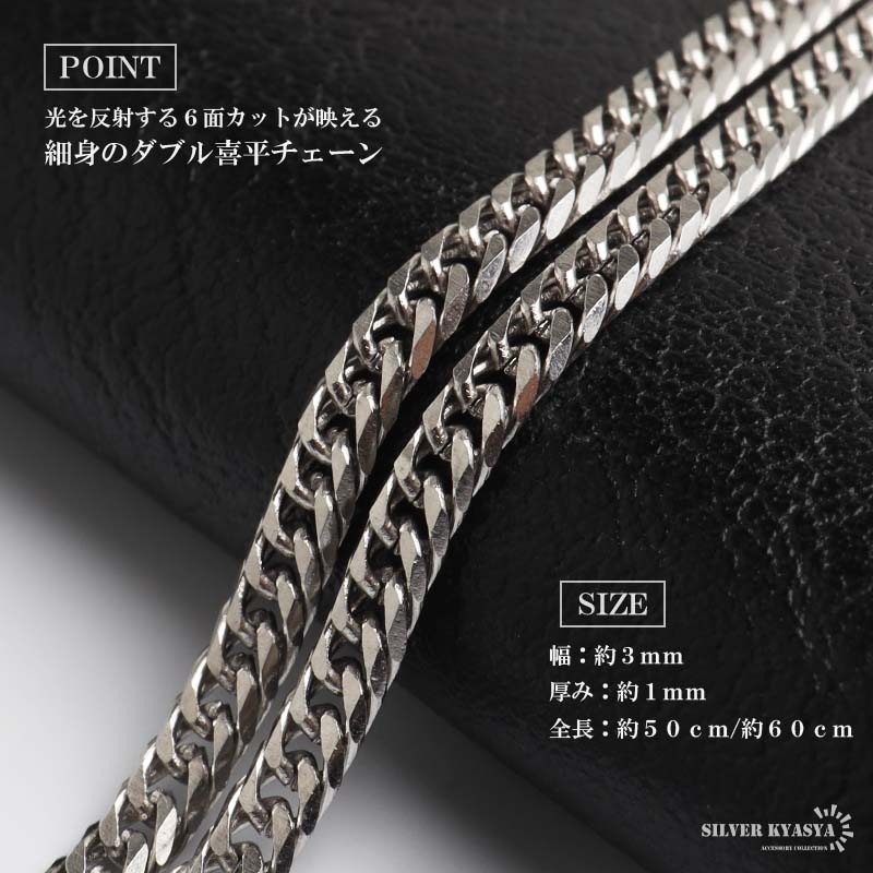 | | トップ:縦約38mm×横約10mm(バチカンを含む) 厚み:約5mm ダブル喜平チェーン:幅約3mm、厚み約1mm、全長約50cm/60cm 総重量:約17g(シルバー、50cm計測) |