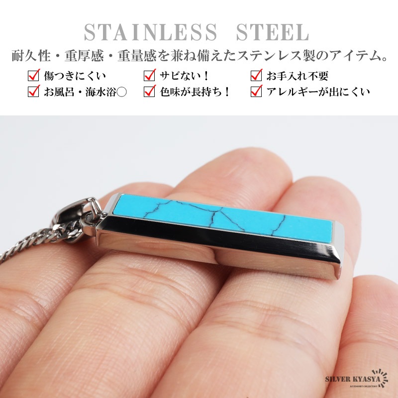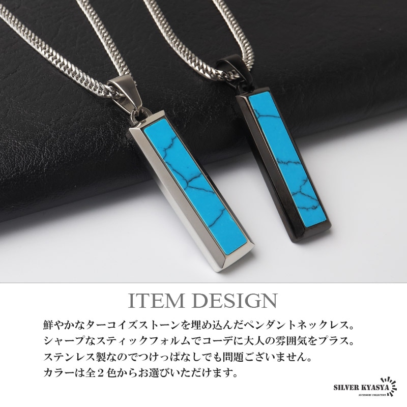 ■ITEM DESIGN 鮮やかなターコイズストーンを埋め込んだペンダントネックレス。シャープなスティックフォルムでコーデに大人の雰囲気をプラス。ステンレス製なのでつけっぱなしでも問題ございません。カラーは全2色からお選びいただけます。 ■安心のステンレスアイテム 頑丈でお手入れも簡単なステンレス製アクセサリー。錆びることもなくサッと拭くだけメンテもかんたん。金属アレルギーが出にくいのもポイントです。 | |