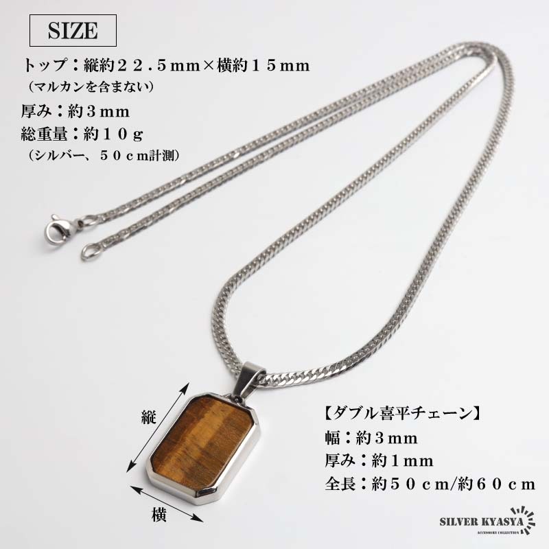 | | トップ:縦約22.5mm×横約15mm(マルカンを含まない) 厚み:約3mm ダブル喜平チェーン:幅約3mm、厚み約1mm、全長約50cm/60cm 総重量:約10g(シルバー、50cm計測) |