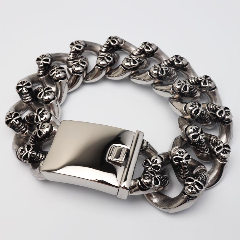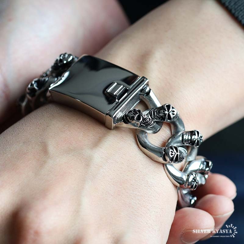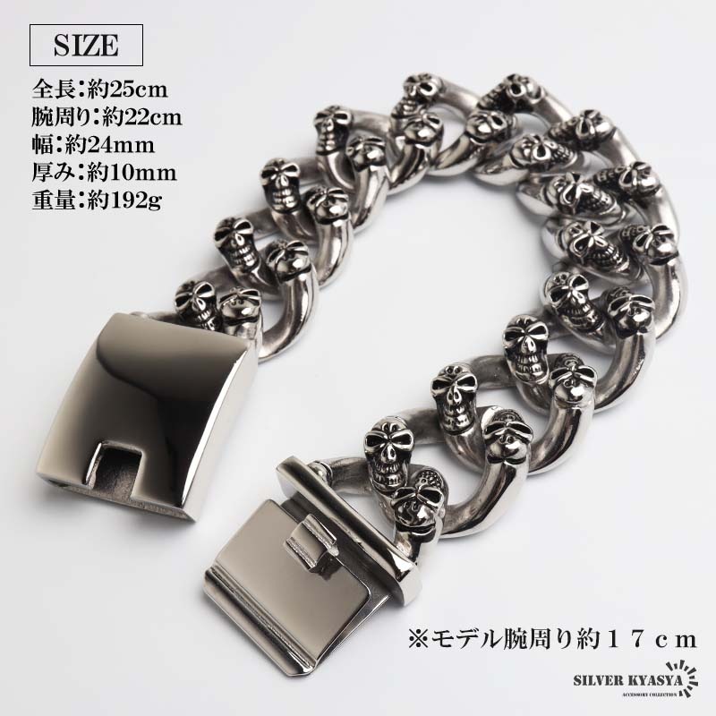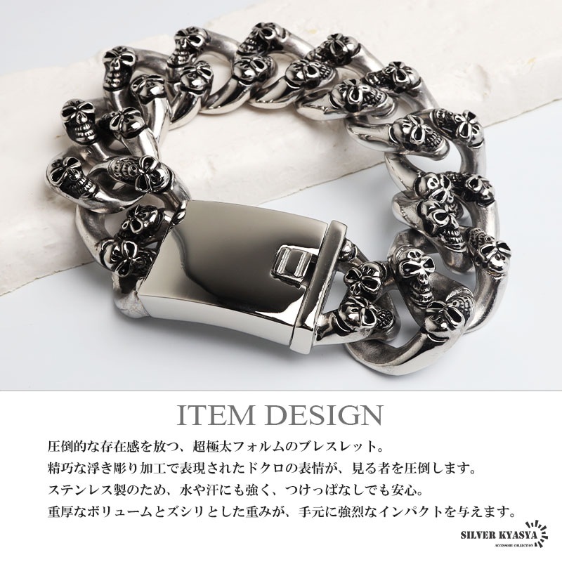 ■ITEM DETAIL 圧倒的な存在感を放つ、超極太フォルムのブレスレット。精巧な浮き彫り加工で表現されたドクロの表情が、見る者を圧倒します。ステンレス製のため、水や汗にも強く、つけっぱなしでも安心。重厚なボリュームとズシリとした重みが、手元に強烈なインパクトを与えます。 ■安心のステンレスアイテム 頑丈でお手入れも簡単なステンレス製アクセサリー。錆びることもなくサッと拭くだけメンテもかんたん。金属アレルギーが出にくいのもポイントです。 | |