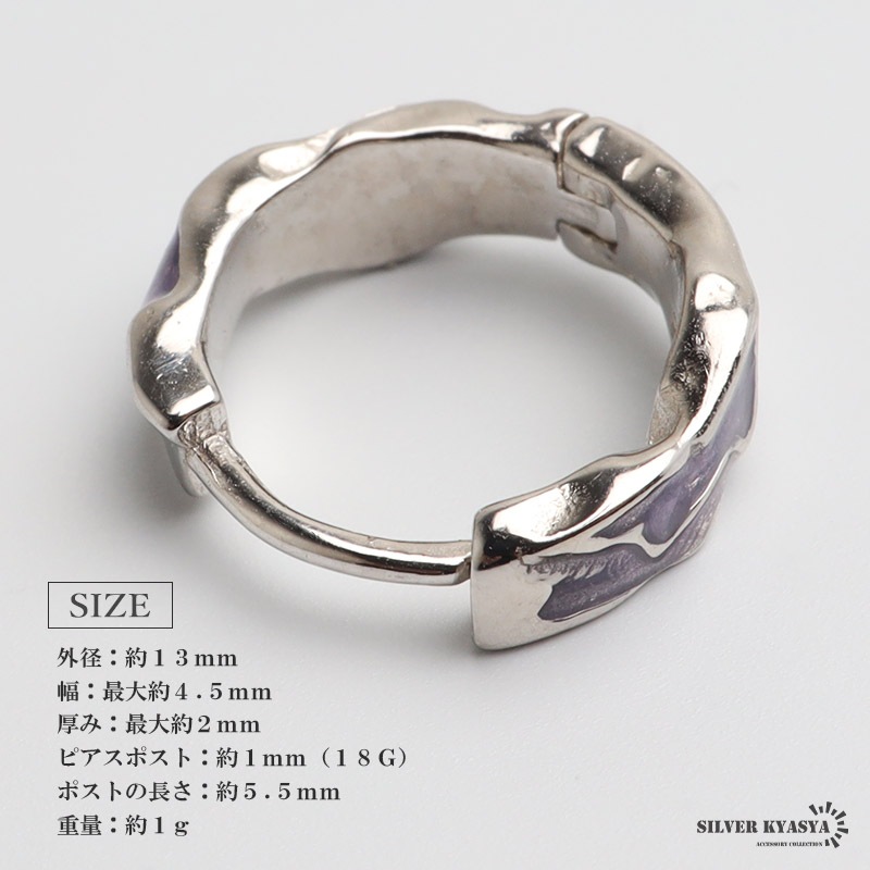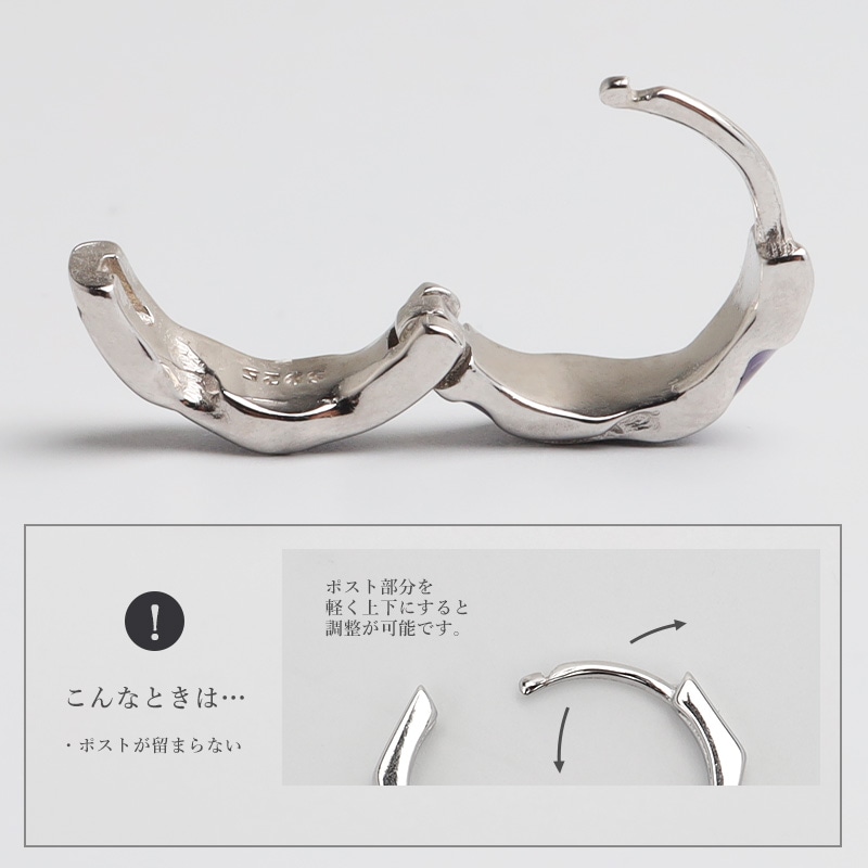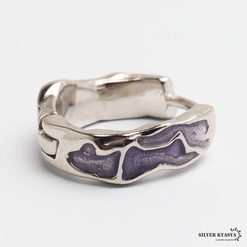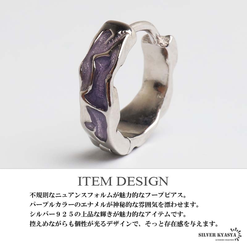 ■ITEM DETAIL 不規則なニュアンスフォルムが魅力的なフープピアス。パープルカラーのエナメルが神秘的な雰囲気を漂わせます。シルバー925の上品な輝きが魅力的なアイテムです。控えめながらも個性が光るデザインで、そっと存在感を与えます。 ■大人のシルバー925 大人の魅力あふれるシルバー925素材を採用。「925」とは銀の含有率(純度)92.5%を示し、一般的に純銀として扱われます。サビや劣化等がほとんどなく金属アレルギーも出にくいとされており、アクセサリーとしての実用性もある金属です。 | |
