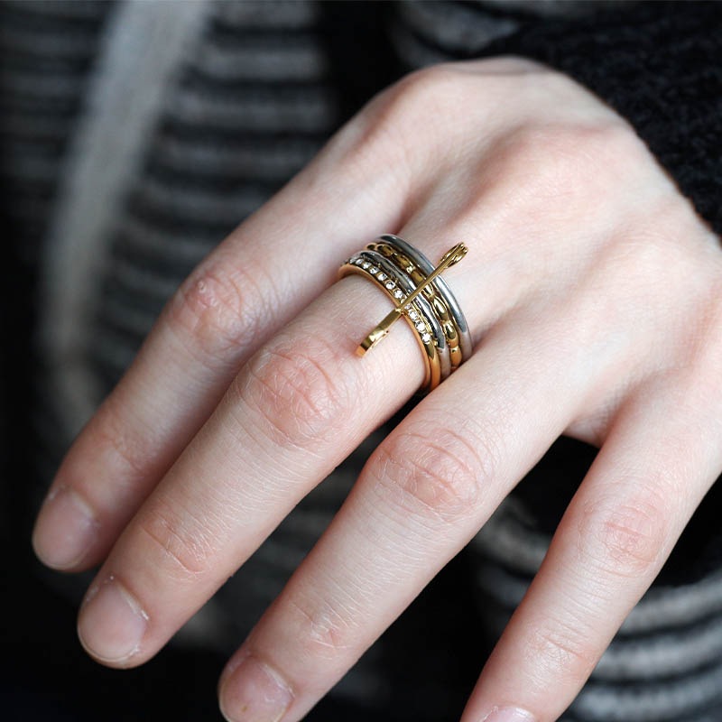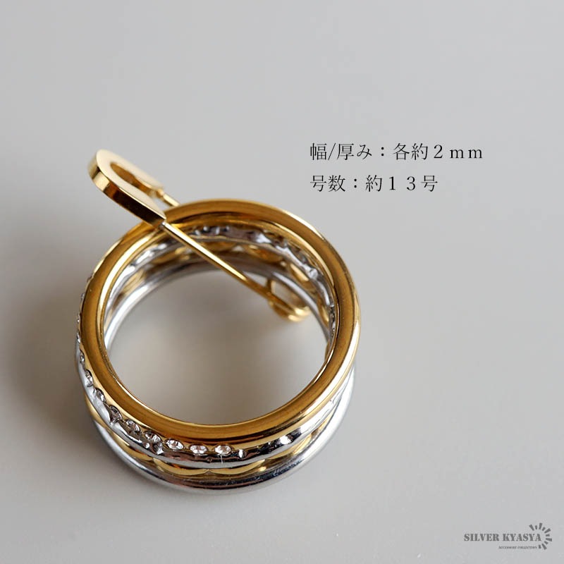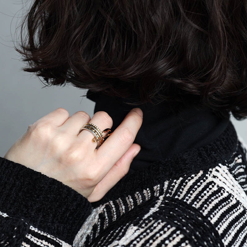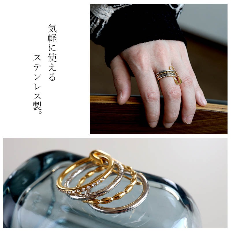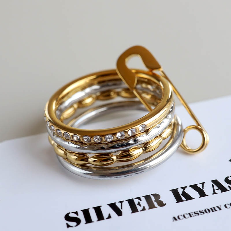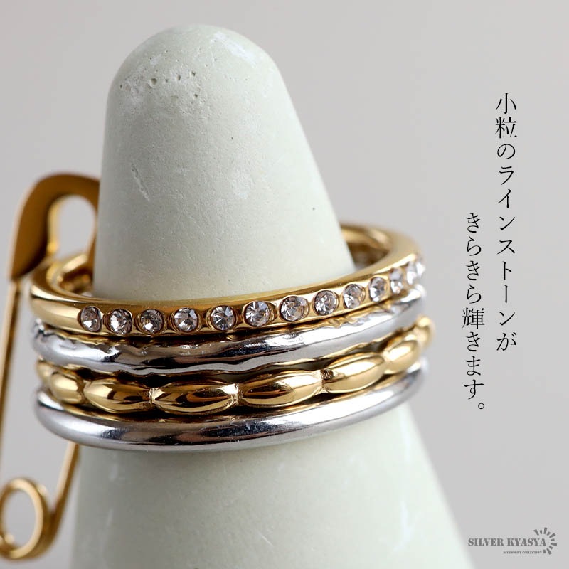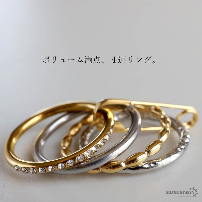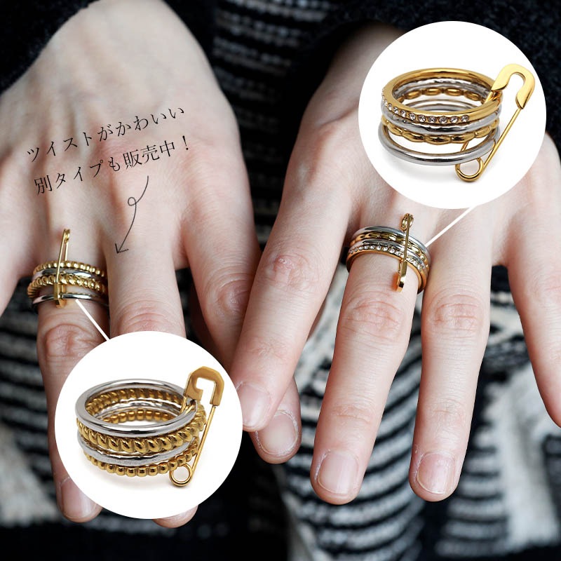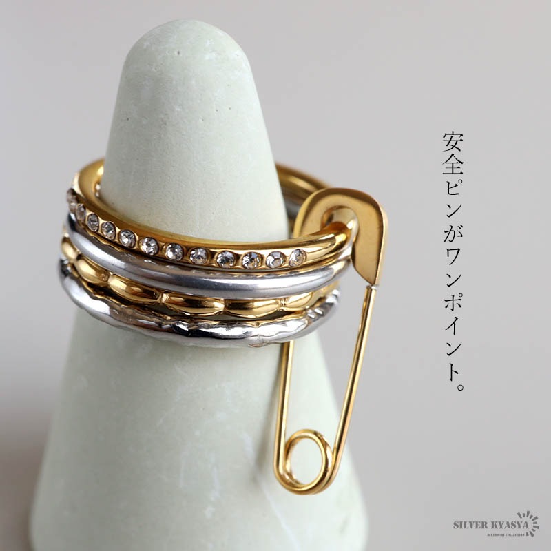 ■ITEM DESIGN 安全ピンをセットした4連リング。ボリューム満点な4点リングは個性あふれるデザインの組み合わせ。小粒ながらもキラキラ輝くストーン付き。これだけで普段と違うスタイルを楽しめます。 ■気軽に使えるステンレス製 頑丈でお手入れも簡単なステンレス製アクセサリー。錆びることもなくサッと拭くだけメンテもかんたん。金属アレルギーが出にくいのもポイントです。 | |