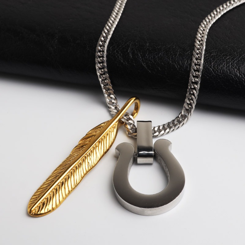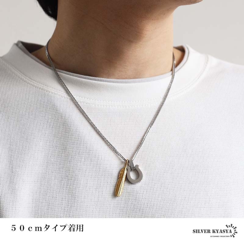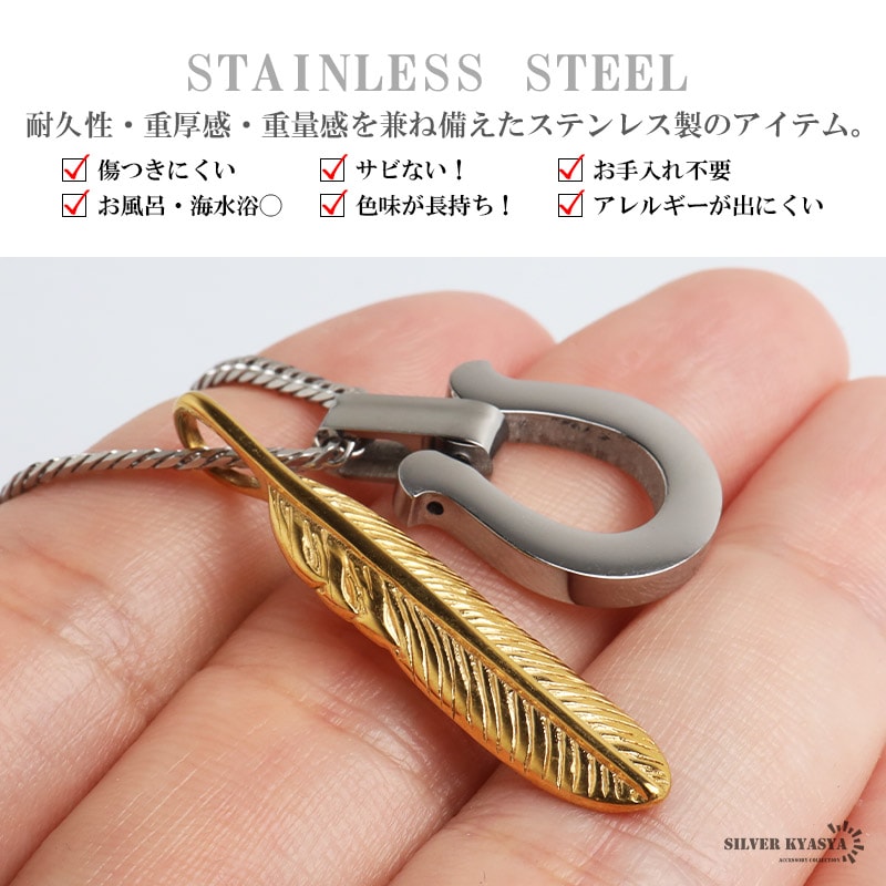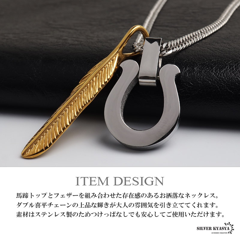 ■ITEM DETAIL 馬蹄トップとフェザーを組み合わせた存在感のあるお洒落なネックレス。ダブル喜平チェーンの上品な輝きが大人の雰囲気を引き立ててくれます。素材はステンレス製のためつけっぱなしでも安心してご使用いただけます。 ■安心のステンレスアイテム 頑丈でお手入れも簡単なステンレス製アクセサリー。錆びることもなくサッと拭くだけメンテもかんたん。金属アレルギーが出にくいのもポイントです。 | |