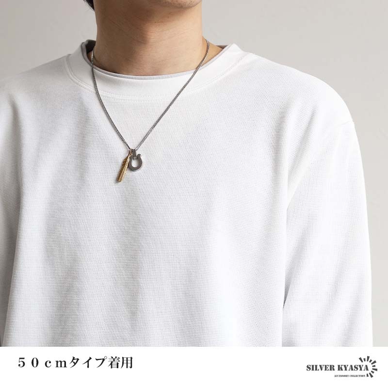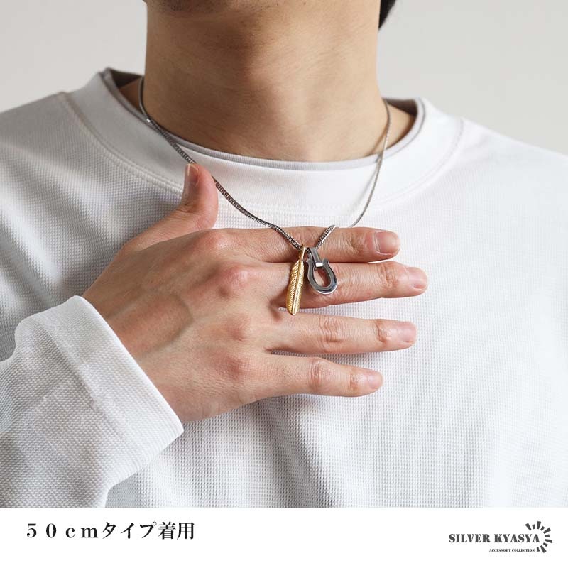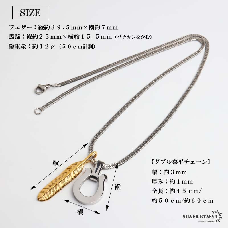 | | フェザー:縦約39.5mm×横約7mm 馬蹄:縦約25mm×横約15.5mm(バチカンを含む) 総重量:約12g(50cm計測) ダブル喜平チェーン:幅約3mm、厚み約1mm、全長約45cm/約50cm/約60cm |