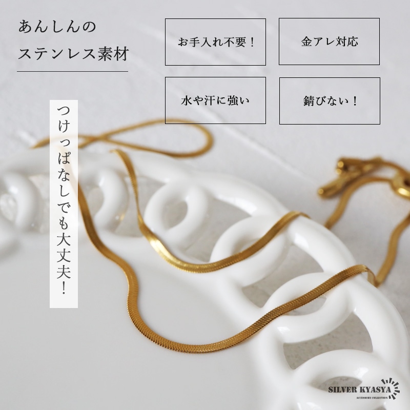 ■ITEM DETAIL キラキラ輝くしなやかスネークチェーンネックレス。長さは全4サイズ。ラリエットやチョーカーなど長さによって色んなつけ方が楽しめます♪。ステンレス製なのでつけっぱなしでも問題ございません。カラーは全2色からお選びいただけます。 ■安心のステンレスアイテム 頑丈でお手入れも簡単なステンレス製アクセサリー。錆びることもなくサッと拭くだけメンテもかんたん。金属アレルギーが出にくいのもポイントです。 ■ニュアンスデザインのマンテル留め具 普通の輪っかと違いぷっくりと変形したデザインがチャームポイント。 | |
